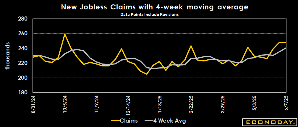 With initial claims over the past two weeks at their highest level since the week ended October 5, 2024, the 4-week average was up 5,000 to 240,250 in the June 7 week, the highest since August 26, 2023 week.