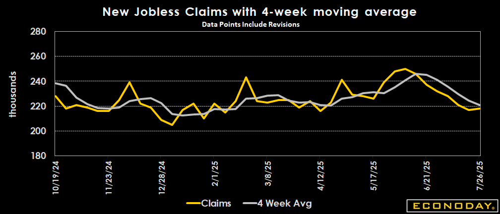 Initial jobless claims came in below expectations, with the level reported in the week ending July 26 up 1,000 from the unrevised 217,000 level reported for the prior week. The July 26 week's level compares to the consensus of 225,000 in the Econoday survey of forecasters. The four-week moving average is down 3,500 to 221,000 in the July 26 week.