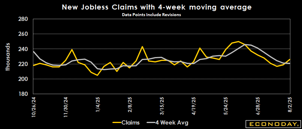 Initial jobless claims came just above expectations, with the level reported in the week ending August 2 up 7,000 from the revised 219,000 level (previously 218,000) reported for the prior week. The August 2 week's level compares to the consensus of 220,000 in the Econoday survey of forecasters. The four-week moving average is down 500 to 220,750 in the August 2 week.