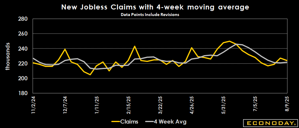 Initial claims came in at the low end of expectations as they declined 3,000 to 224,000 in the week ended August 9, below the 230,000 consensus in an Econoday survey. Estimates had ranged from 220,000 to 233,000.