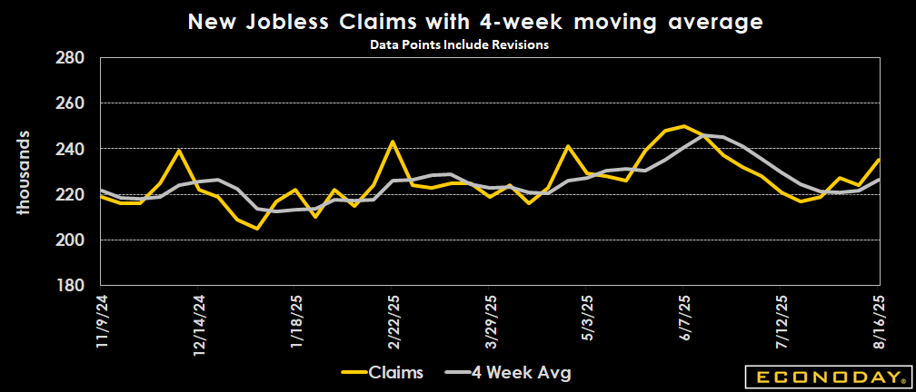 Initial claims numbers rose this week but remain at a comfortably low level. However, persistently elevated continuing claims (above 1.9 million for 13 straight weeks and again hitting the highest level since November 2021) supports the argument that the central bank needs to take action in September to support a weakening labor market.