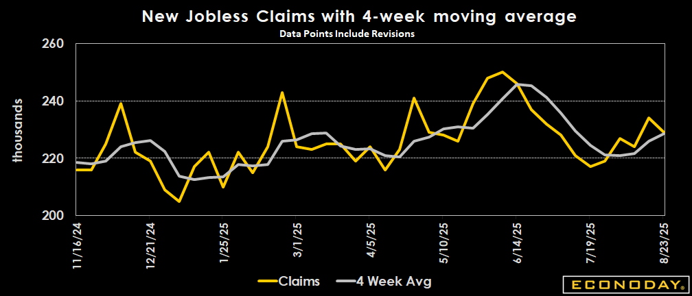 Initial claims decreased 5,000 to 229,000 in the week ended August 23, below the 230,000 consensus in an Econoday survey, which had the lowest forecast at 228,000.