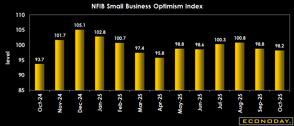 The small business optimism index reflects overall little change in conditions in October from September with the reading hovering at levels that suggest only narrowly positive confidence. The NFIB small business optimism index in October is down slightly to 98.2 in October from 98.8 in September. The October index essentially matches the consensus of 98.3 in the Econoday survey of forecasters. The index remains above the 52-year average of 98 for the seventh month in a row but moving lower for a second month. The uncertainty index is down 12 points to 88 in October, the lowest since 86 in December 2024. If survey respondents are less uncertain about the outlook, they remain uneasy.