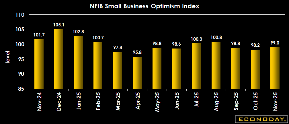 The NFIB small business optimism index remains in a narrow range around the 52-year average of 98 for the seventh month in a row. The November index is up 0.8 point to 99.0 compared to the consensus of 98.0 in the Econoday survey of forecasters. Readings remain consistent with an uncertain outlook despite continued moderate expansion. The uncertainty index is up 3 points to 91 in November. The uncertainty index has been elevated for the last 18 months.