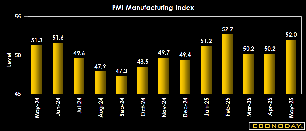 The S&P Global US Manufacturing Purchasing Managers' Index came in at 52.0 in May, compared to 50.2 in April, and almost meeting expectations for 52.3 in the Econoday survey of forecasters. New orders increased on the back of efforts to get ahead of tariff-related price increases and supply chain disruption.