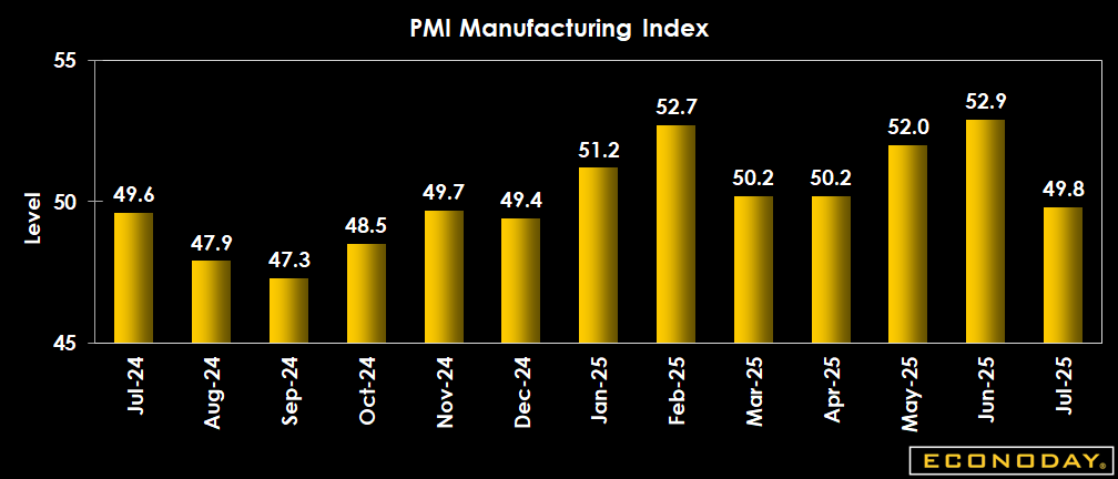 The S&P Global US Manufacturing Purchasing Managers' Index came in at 49.8 in July, compared to 52.9 in June, and just above expectations for 49.5 in the Econoday survey of forecasters. Operating conditions worsened as demand stalled, and the tariffs continue to loom over the manufacturing sector.