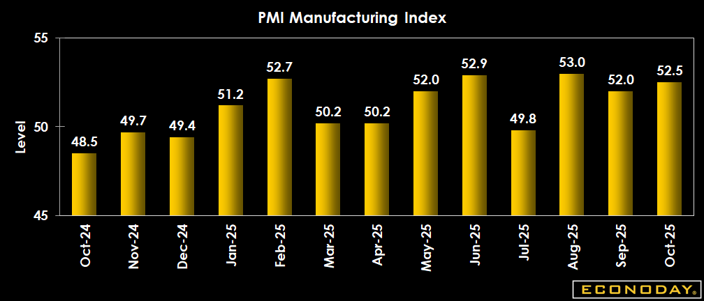 The S&P Global US Manufacturing Purchasing Managers' Index improved to 52.5 in October (up from the 52.2 flash estimate), compared to 52.0 in September, and better than expectations for no change in the Econoday survey of forecasters. Tariffs continue to be a drag on exports, while stronger output and new orders fuel domestic activity. Trade policy uncertainty is also limiting confidence in the outlook.