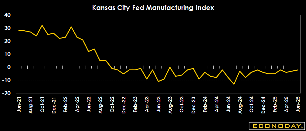 Kansas City Fed district manufacturing activity continues its slow decline in June with contraction at roughly the same pace as in May. The Kansas City Fed composite index of current business conditions is at minus 2 in June compared with minus 3 in May. Employment is notably weaker while price pressures accelerate.