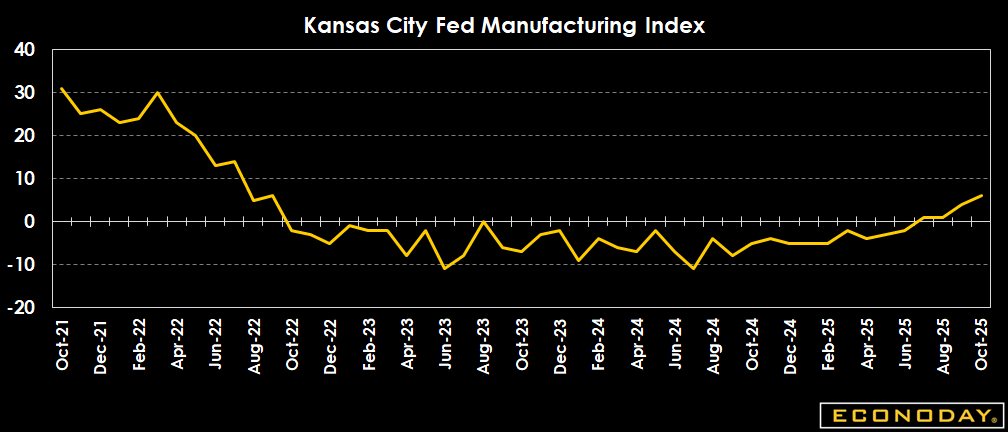 The Kansas City Fed composite index of current business conditions is at 6 in October versus 4 in September, 1 in August and minus 5 in October 2024. The index was negative, indicating contraction, for all of 2024 and for 2025 through June when it was at minus 2.