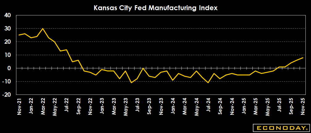 The Kansas City Fed index offers a monthly assessment of change in the region's manufacturing sector. Positive readings indicate monthly growth and negative readings monthly contraction. Readings at zero indicate no change. The headline number is the composite index, an average of the production, new orders, employment, delivery time, and raw materials inventory indexes.
