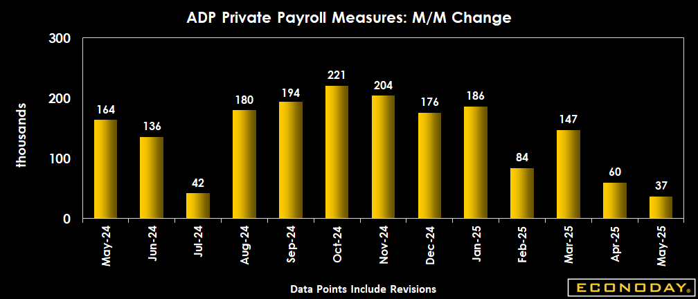 The ADP national employment report shows just 37,000 jobs added to private payrolls in May after a downward revision to up 60,000 in April (previously +62,000). The May increase is nowhere near the consensus of up 110,000 in the Econoday survey of forecasters. The small rise reflects the struggles of small businesses. By sector, there are mixed hiring conditions in the service-providing sector while goods-producers saw more declines.