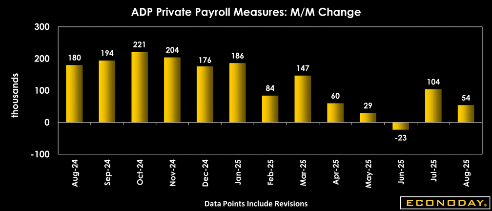 The ADP national employment report for August shows private sector payrolls up 54,000 after a minor upward revision to up 106,000 in July. The increase is below the consensus of up 68,000 in the Econoday survey of forecasters. Payroll gains are mixed. Sectors with gains were more plentiful than those with losses, but the decreases are more widespread than in recent months. The overall pace of hiring is slowing.