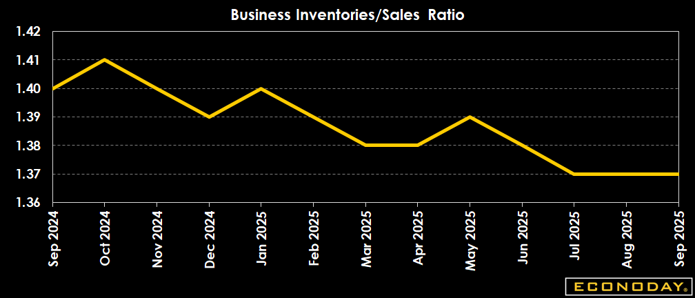 The total business inventories/sales ratio at the end of September is 1.37 compared to 1.37 in August, and 1.40 in September 2024.