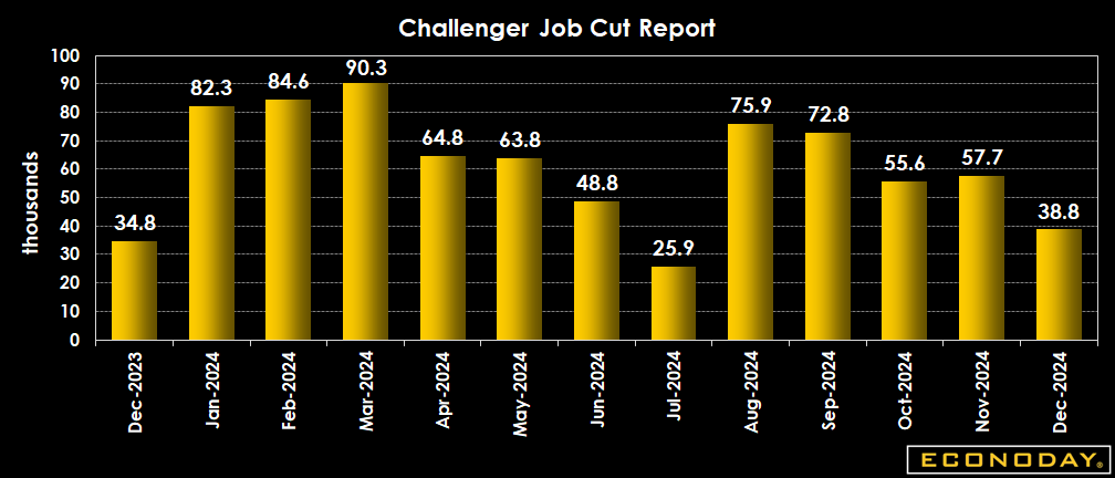 The Challenger report on layoff intentions in December shows 38,792 announcements, down 32.8 percent from the prior month but up 11.4 percent from a year ago. For all of 2024, total layoff intentions are 761,358, up from 721,677 in 2023 and the highest since the pandemic-driven rise in 2020 to 2,304,755. Outside the pandemic, it is the highest since 2009 when 1,288,030 job cuts were announced.