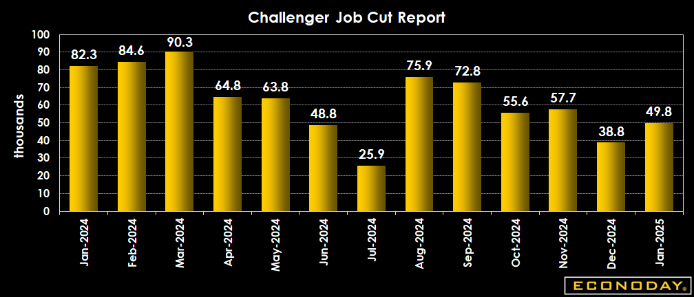 The Challenger report on announced layoff intentions shows a 28.4 percent increase to 49,795 in January after 38,792 in December but is down 51.6 percent compared to 82,307 in January 2024. Overall, layoff activity is relatively quiet and broad-based. A few sectors are continuing to restructure to cut costs and/or underperforming locations. However, many businesses anticipate replacing lost workers at a future time could be more expensive than keeping current workers on payroll.