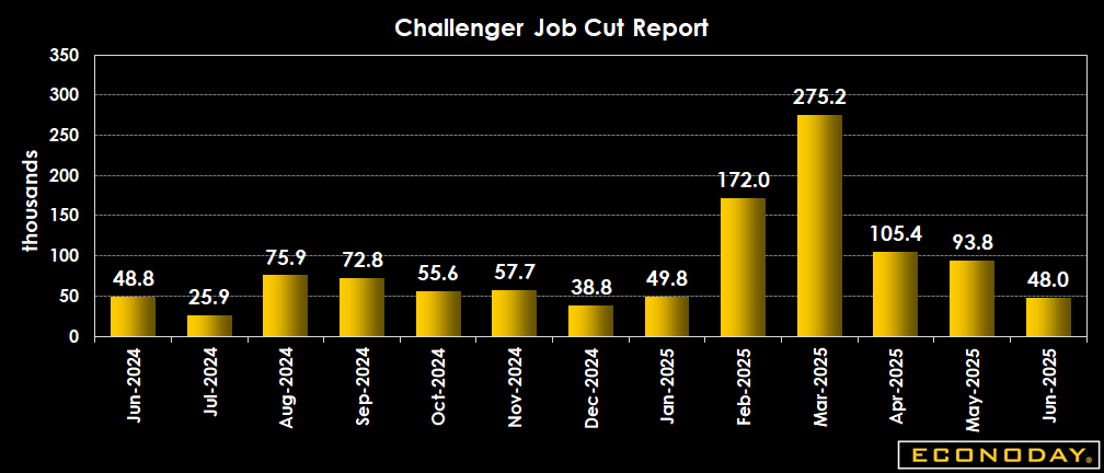 The Challenger report on layoff intentions in June shows a slowdown in planned job cuts after a busy start to the year. However, layoffs are now broad-based rather than deep cuts in a few sectors like government, technology, and retail. Businesses remain uncertain about the near future. They may be reluctant to lose skilled workers who could be difficult and expensive to replace. Many cuts will be eliminating open positions and previously planned hiring. Hiring intentions are weak with the majority in a few narrow industry groups. Overall, the labor market is rebalancing with more workers heading for unemployment and fewer employers ready to compete for them.