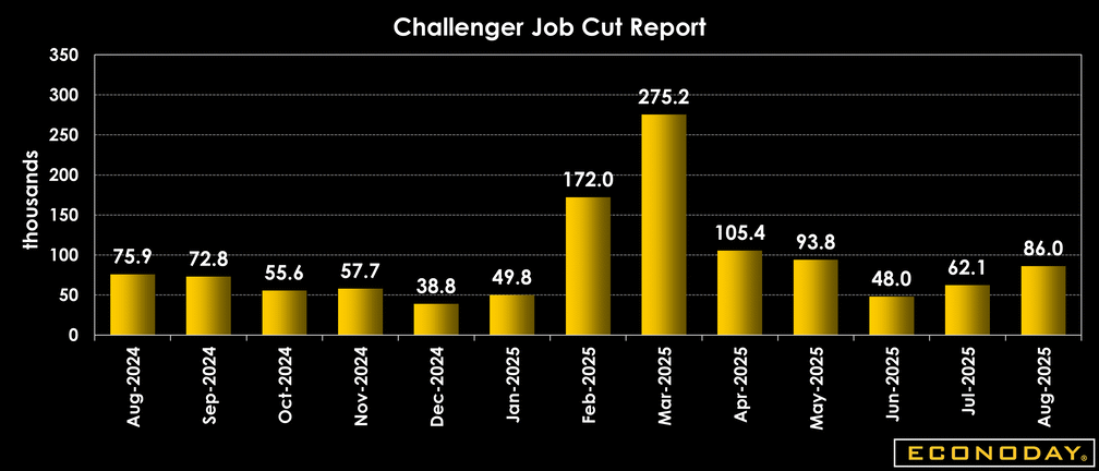 The Challenger report on layoff intentions is up 38.5 percent to 85,979 in August after rising to 62,075 in July, and up 13.3 percent from 75,891 in August 2024. For the year-to-date, layoff intentions total 892,362, substantially higher than 536,421 for the first eight months of 2024.