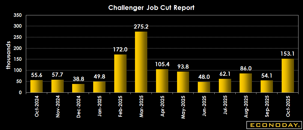 The Challenger job cut intentions report for October jumps 183.1 percent to 153,074 after 54,064 in September and is up 175.1 percent from 55,597 in October 2024. Every industry except for legal announced at least some layoffs in October. The year-to-date total for 2025 is 1,099,500 compared to 664,839 in the same period last year. This is the highest since 2,162,904 in the first 10 months of 2020 and 1,032,033 in the comparable period of 2009.