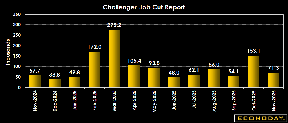 The Challenger job cut intentions report for November sees a decrease of 53.4 percent to 71,321 from 153,074 in October but is up 23.5 percent compared to 57,727 in November 2024. While the month-over-month decline is significant, job cut plans are still far more prevalent for 2025 to date (1,170,821) than in the first eleven months of 2024 (722,566). While DOGE actions have accounted for a large number of job cuts (293,753), 2025 still shows a noticeable increase in job cut plans.