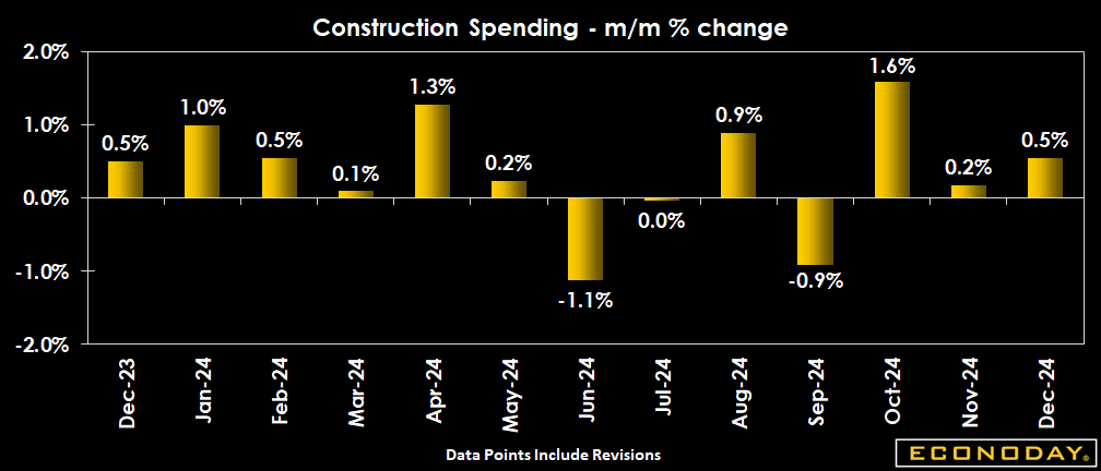 U.S. construction spending in December is estimated to have risen more than expected, up 0.5 percent compared to expectations of a 0.3 percent increase in the Econoday survey of forecasters. November is revised from being flat to increasing by 0.2 percent from October. The estimated level of construction spending in December is 4.3 percent higher than December 2023.
