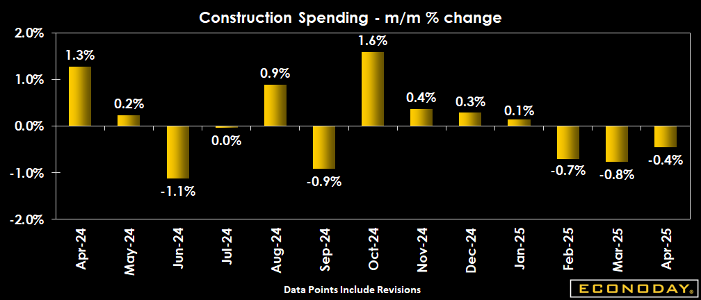 The dollar value of construction put in place is down 0.4 percent in April from March. This is below the consensus of up 0.4 percent in the Econoday survey of forecasters. Total construction spending is down for the third month in a row. The total is down 0.5 percent compared to a year ago. On a year-over-year basis, spending on new construction has been steadily declining since a near-term peak at up 9.8 percent in January 2024.