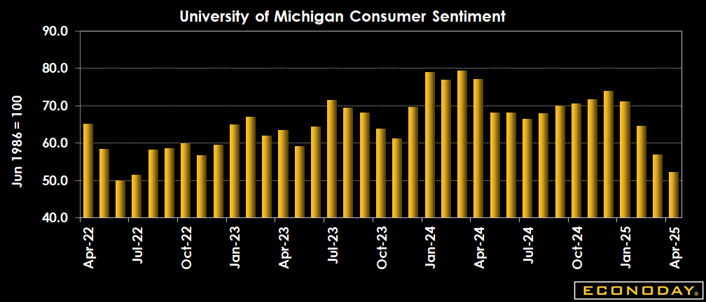 After an unexpectedly nasty 11 percent drop in the preliminary April reading to 50.8 from 57.0 in March, forecasters see the index relatively steady at 50.5 in the final April report. One-year inflation expectations are seen unrevised at a shocking 6.7 percent from the preliminary April report. That is up from 5.0 percent in March, 4.3 percent in February, 3.3 percent in January and 2.8 percent in December, all reflecting tariff effects.