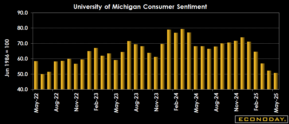 U.S. consumer sentiment continues its downward spiral declining each month so far in 2025 with April's preliminary estimate coming in at 50.8 vs. April's final reading of 52.2 and 57.0 in March, below expectations for 53.0 in the Econoday survey of forecasters.