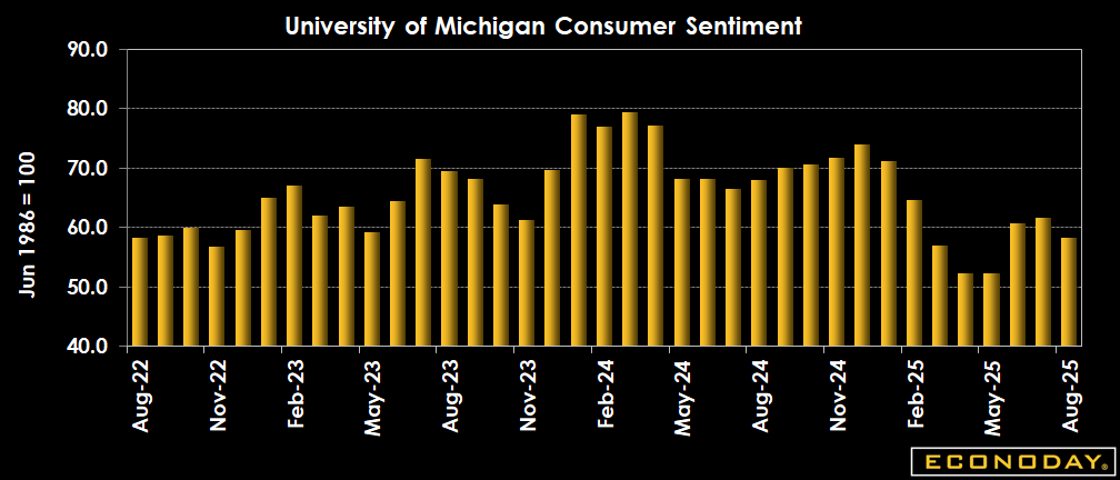U.S. consumer sentiment declined from last month and came in just below expectations, with August's final reading coming in at 58.2 vs. 61.7 in July and 60.7 in June. This compares to the consensus of 58.6 in the Econoday survey of forecasters.