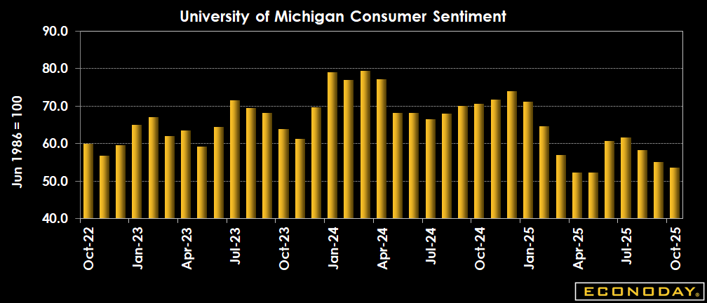 U.S. consumer sentiment declined this month, with October's final reading coming in at 53.6 (revised from 55.0) vs. 55.1 in September and 58.2 in August. This matches the consensus in the Econoday survey of forecasters.