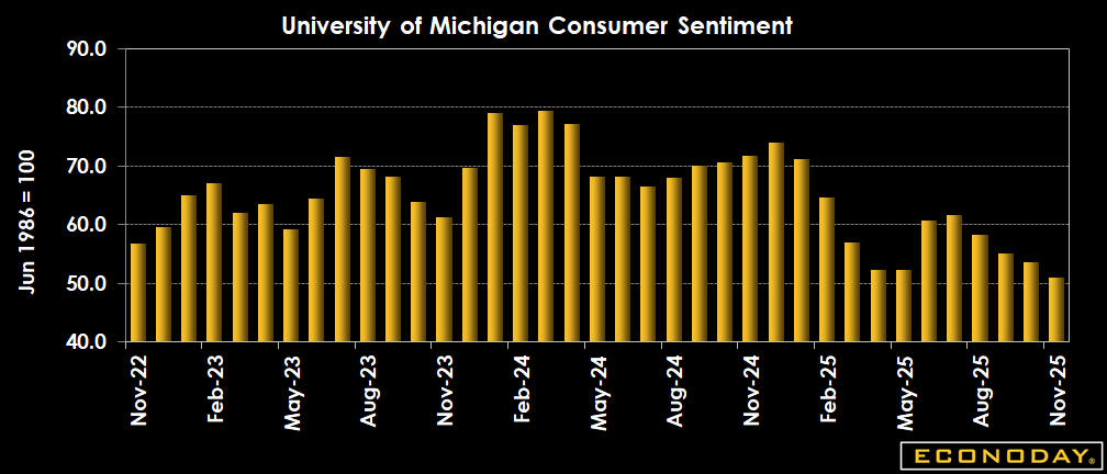 U.S. consumer sentiment declined this month, with November's final reading coming in at 51.0 (revised from 50.3) vs. 53.6 in October and 55.1 in September. This is better than the consensus of 50.5 in the Econoday survey of forecasters. Persistent high prices and incomes failing to keep up with inflation continue to affect sentiment.