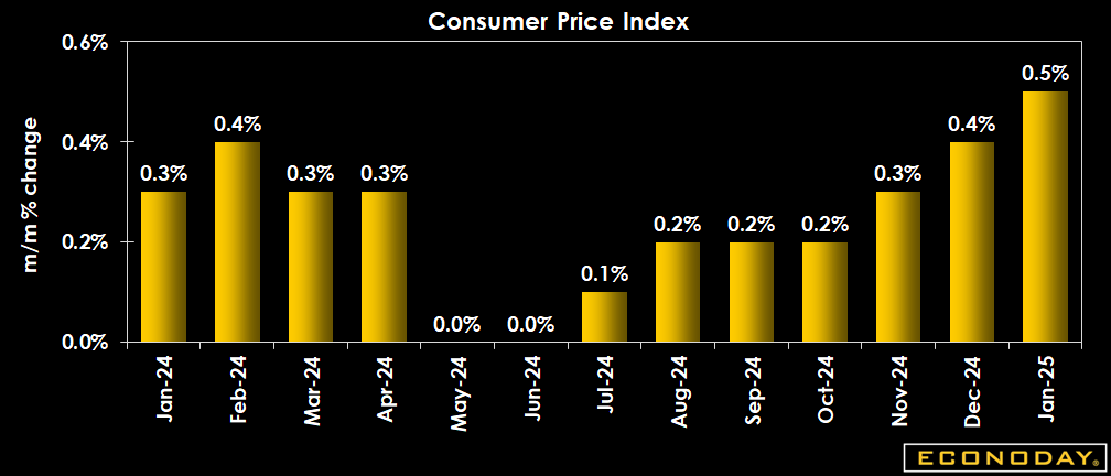 The Consumer Price Index in January jumped 0.5 percent, following a 0.4 percent increase in December, and a 0.3 percent rise in November. This compares to expectations for a 0.3 percent rise in the Econoday survey of forecasters. The overall monthly rise in consumer prices is the largest spike since August 2023.