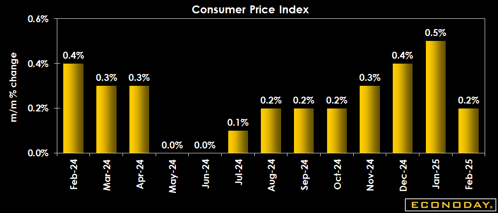 The Consumer Price Index in Feburary rose by just 0.2 percent, following a 0.5 percent jump in January, and a 0.4 percent rise in December. This compares to expectations for a 0.3 percent rise in the Econoday survey of forecasters. The slowdown in the pace of consumer price increases comes after a steep rise in the CPI between November 2024 and January 2025.
