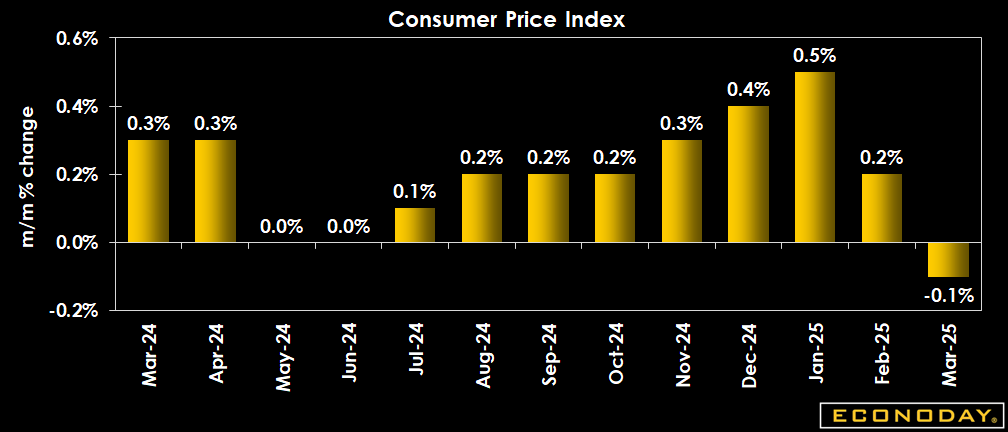 The Consumer Price Index in March declined by 0.1 percent, following a 0.2 percent uptick in February, and a 0.5 percent jump in January. This compares to expectations for a 0.1 percent rise in the Econoday survey of forecasters. The slowdown in the pace of consumer price continues after a steep rise in the CPI between November 2024 and January 2025.