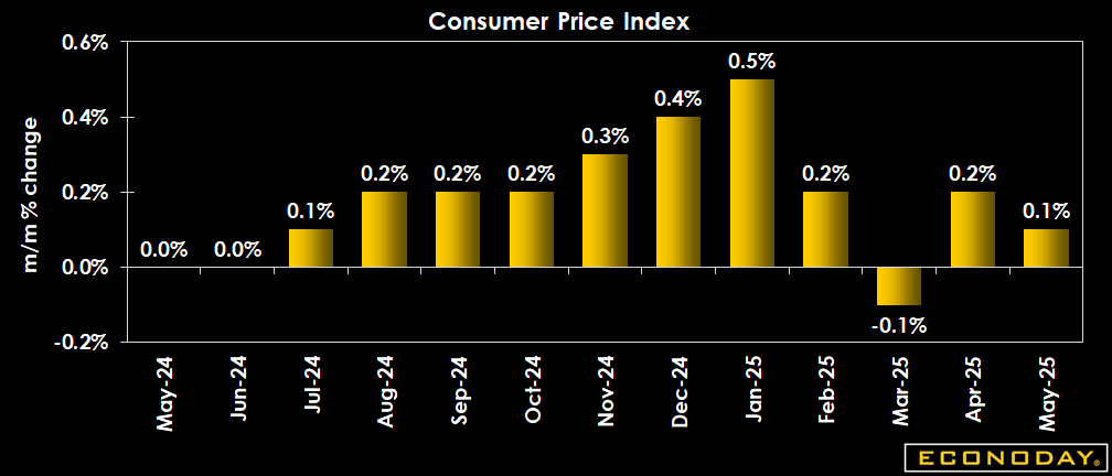 The Consumer Price Index in May slowed to +0.1 percent, following a 0.2 percent rise in April, and a 0.1 percent decline in March. This compares to expectations for a 0.2 percent rise in the Econoday survey of forecasters. The slowdown in the pace of consumer price continues after a steep rise in the CPI between November 2024 and January 2025.