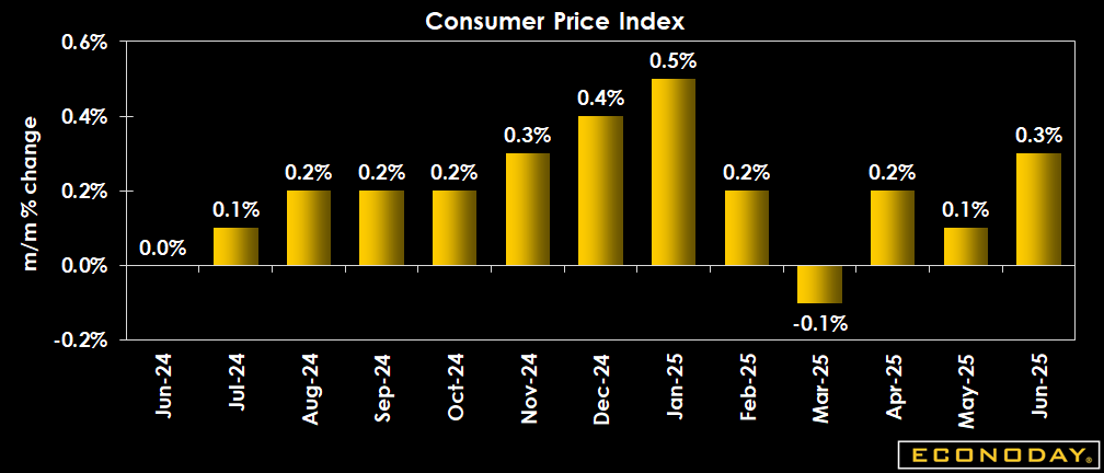 The Consumer Price Index in June ramped up by +0.3 percent, following a 0.1 percent rise in May, and a 0.2 percent jump in April. The June CPI reading matches expectations for a 0.3 percent rise in the Econoday survey of forecasters. This ends the slowdown in the monthly pace of overall consumer price inflation seen between February and May.