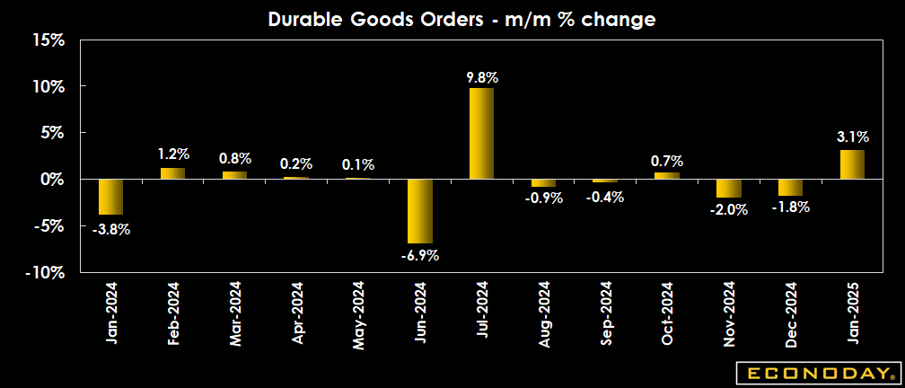 New orders for durable goods came in stronger than expected in the headline figure with a rise of 3.1 percent versus a 1.9 percent increase in the Econoday consensus, with transportation orders the big swing factor again. The December figure was revised to show a 1.8 percent decrease from a 2.2 percent drop previously reported. In November, orders fell 2.0 percent on the month.