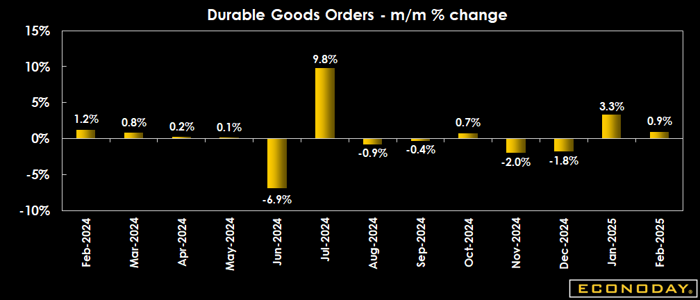 New orders for manufactured durable goods in February, increased 0.9 percent, compared to expectations for a 1 percent decline in the Econoday survey of forecasters. This followed a revised 3.3 percent jump in January (previously reported as +3.1 percent), and a 1.8 percent December decrease.