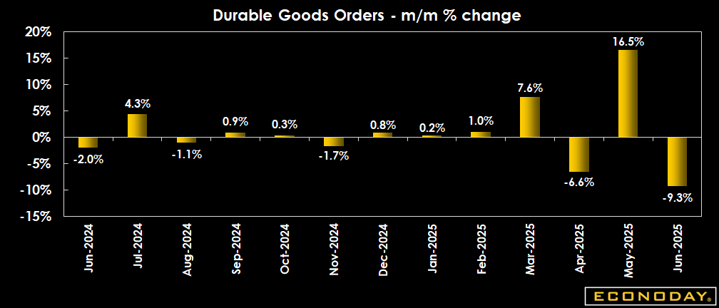 After soaring in May, aircraft orders are down in June, which is expected to leave total durable goods orders down 11.0 percent. Ex-aircraft is seen up 0.1 percent and core capital goods up 0.2 percent, not a bad showing.