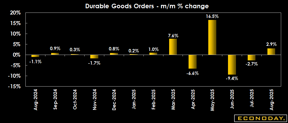 New orders for manufactured durable goods surged unexpectedly in August, up 2.9 percent beating expectations for a 0.5 percent drop in the Econoday survey of forecasters. This rebound, however, does not do much to make up for the revised 2.7 percent contraction in July (previously reported as -2.8 percent), and a 9.4 percent decline in June.