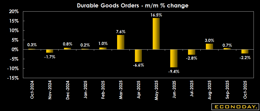 Durables orders fall somewhat more than expected at a decrease of 2.2 percent in October from September versus the decline of 1.5 percent in the Econoday consensus expectation. As usual, the swing factor is transportation orders as the ex-transportation figure is up 0.2 percent, very close to the expected 0.1 percent increase.