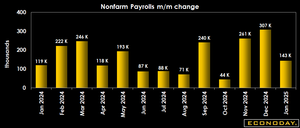 Nonfarm payrolls are up 143,000 in January after a net upward revision of 100,000 in the prior two months. The increase in January is below the consensus of up 168,000 in the Econoday survey of forecasters. The increase is consistent with moderate hiring at a pace able to absorb new entrants to the labor market as well as workers already there and looking for work.