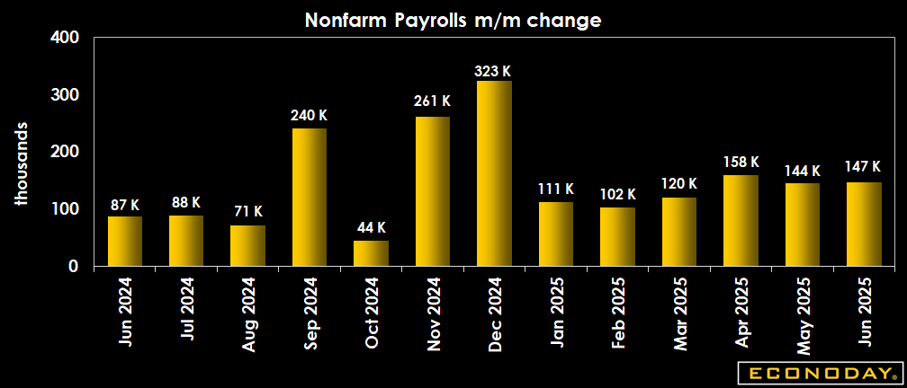 Nonfarm payrolls are up 147,000 in June with a small net upward revision of 16,000 in the prior two months. The June increase is above the consensus of 110,000 in the Econoday survey of forecasters. However, the apparent strength of hiring is largely from gains of 40,300 in state government education and 33,000 in local government education which boosted government hiring by 73,000. Private sector hiring is up 74,000 in June with a gain of 6,000 among goods-producers and 68,000 among service-providers. Private sector services are higher mostly from hiring 39,200 workers in health care. Despite the strong headline increase, payrolls rose substantially in only a few narrow sectors that are unlikely to be repeated in the coming months.