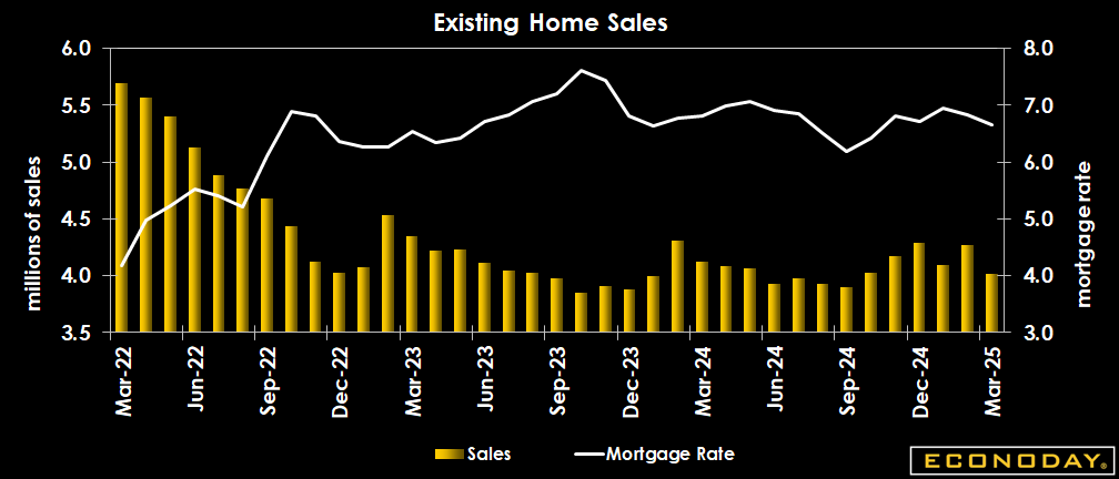 Sales of existing homes are down 5.9 percent in March to a 4.02 million unit seasonally adjusted annual rate. The March level is down 2.4 percent from a year ago, the second month in a row for a year-over-year decline. The level is below the consensus forecast of 4.12 million units in the Econoday survey of forecasters. The decline reflects lower sales across all regions. Sales are down 2.0 percent in the Northeast, 5.0 percent in the Midwest, 5.2 percent in the South, and 9.4 percent in the West.