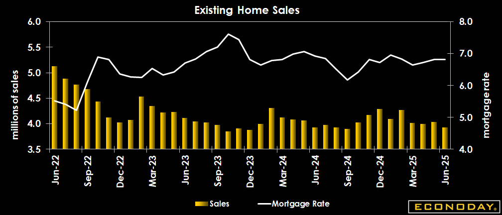 NAR data on sales of existing homes in June show a 2.7 percent decrease to a 3.93 million unit seasonally adjusted annual rate, a little below the consensus of 4.00 million units in the Econoday survey of forecasts. Sales of single-family homes is down 3.0 percent to 3.57 million units while multi-unit sales are unchanged at 360,000 units in June.
