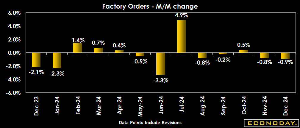 U.S. factory orders fell 0.9 percent in December, following a revised 0.8 percent decline (previously -0.4 percent) in November, and a 0.5 percent rise in October. This exceeded expectations in the Econoday survey of forecasters for a 0.6 percent contraction.