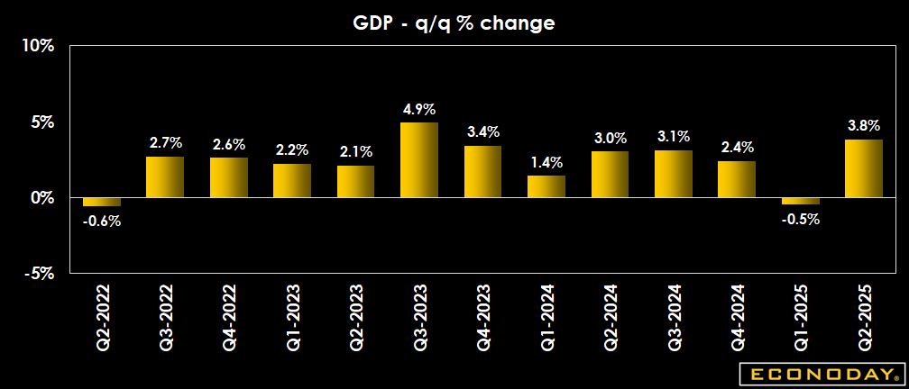 While the upward revision to second quarter growth is welcome, at this stage the third quarter is already well advanced. Early signs are that consumer spending is once more active in anticipation of higher prices and that businesses are adapting as best they can to the changing tariff and trade environment. The GDP Nowcasts are averaging just under 2 percent for growth in the third quarter, but there is a lot of data yet to be filled in.
