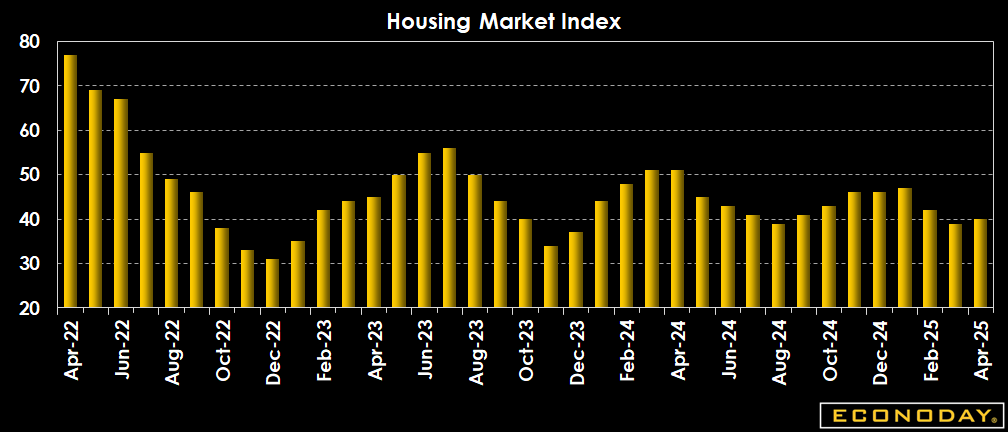 The NAHB/Wells Fargo housing market index up 1 point to 40 in April after an unrevised 39 in March. The April reading is above the consensus of 38 in the Econoday survey of forecasters. The rise is likely due to recent declines in mortgage rates that are now reversing direction. The index has been in contractionary territory for new home building since falling 6 points to 45 in May 2024.