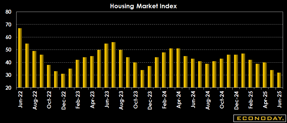 Builder confidence in the market for newly built single-family homes was 32 in June, down from 34 in May and below consensus for 36 in Econoday survey of forecasters. The index has come in lower only twice since 2012 31 in December 2022 and 30 in April 2020 at the start of the COVID-19 pandemic.