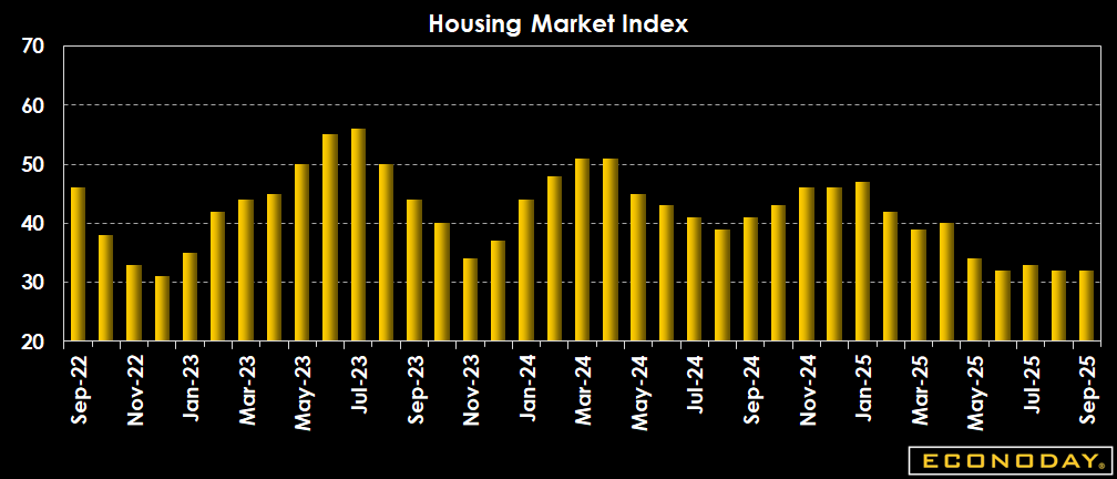 Builder confidence in the market for newly built single-family homes was 32 in September, unchanged from August. Sentiment has remained stranded in negative territory for 17 straight months.