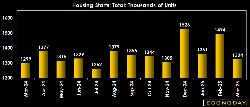Starts of new homes are down 11.4 percent to a seasonally adjusted annual rate of 1.324 million units in March after a small downward revision to 1.494 million units in February. The March level is below the consensus of 1.420 million units in the Econoday survey of forecasters. While the February level is a bounce back from the weather-related dip to 1.361 million units in January, the March number suggests that homebuilders are cutting back on new residential construction. Nonetheless, starts are up 1.9 percent compared to March 2024.